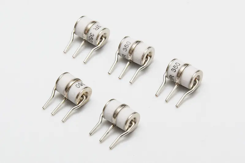 放电管是一个两边封有金属材料,中间一般为陶瓷,内部充有惰性气体的密封式圆形绝缘体,电极从两金属片上引出。根据放电管绝缘空间的大小,分成二级、三级或多级放电管,又以电压的高低分档。